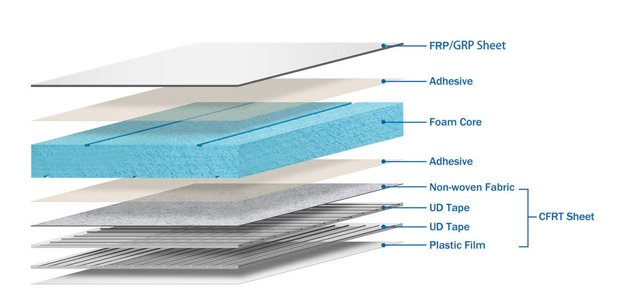FRP/GRP sheets are used as exterior wall panels for RV composite panels, and CFRT sheets are used as interior wall panels.