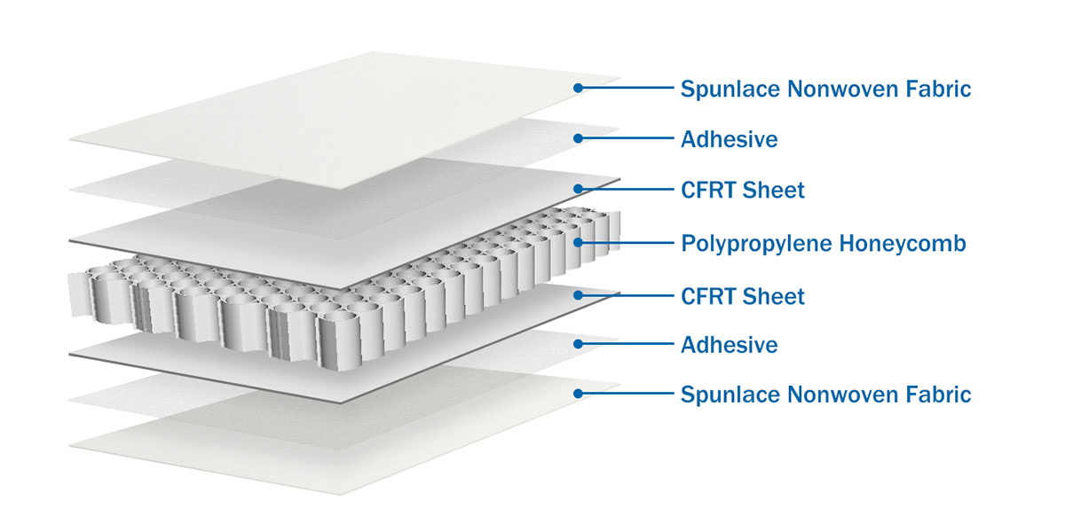 - Top Layer: 120gsm spunlace nonwoven + 0.36mm CFRT (Continuous Fiber Reinforced Thermoplastic) sheet.